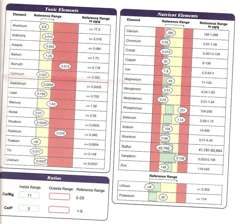 Guest guest Posted July 16, 2007 Report Share Posted July 16, 2007 Hi please help me... I can't make out what the results of the test mean... I got the hair test done from GDX. I'm confused about the bismuth results. Are bismuth and mercury toxicity similar? heres a scan of the results... i don't know how to do the color and pct conversion. i looked over some old posts with results and got really confused. Thanks. http://i54.photobucket.com/albums/g84/callmeinvincible/test.jpg POTENTIALLY TOXIC ELEMENTS element result ref range color ============================================= aluminum 4.8 <= 17.3 antimony .010 <= .016 arsenic .063 <= .080 barium 1.25 <= 1.70 bismuth .613 <= .178 cadmium .007 <= .022 gadolinium .0004 <= .0006 lead .192 <= .700 mercury 1.63 <= 1.32 nickel .07 <= .55 rhodium .0002 <= .0005 rubidium .076 <= .040 thallium Quote Link to comment Share on other sites More sharing options...